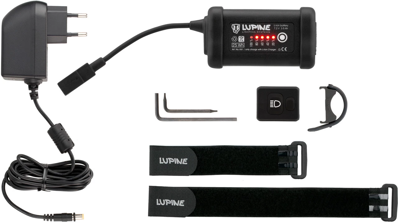 Lieferumfang:1 x LED Frontlicht Lupine SL AF1 x Halterung Lupine für 31,8 mm1 x Li-Ion Akku Lupine SmartCore 3,5 Ah1 x Bluetooth-Fernbedienung 2 Tasten1 x Halterung Lupine Peppi V5 für Bluetooth Fernbedienung2 x Klettband Lupine (kurz/lang)1 x Ladegerät Lupine Wiesel