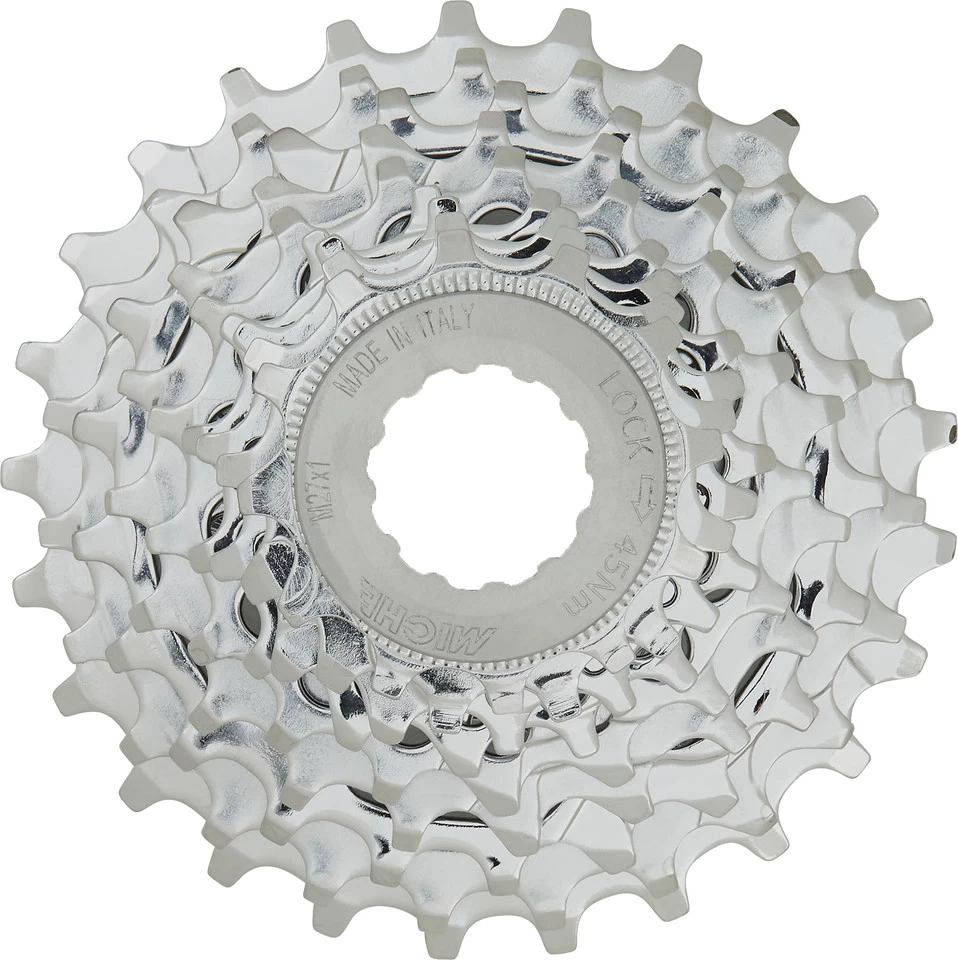 Diese Primato Kassette von Miche hat 9 Ritzel aus verchromtem Stahl und ist mit Campagnolo-FreilÀufen kompatibel.