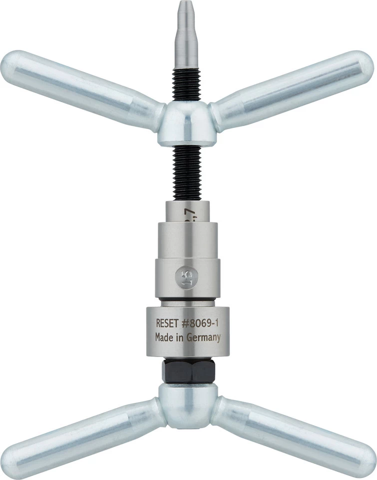 Das Reset Racing Presswerk ist ein vielfältig einsetzbares Ein- und Auspresswerkzeug. Es besteht aus einer soliden Spindel mit gerolltem Gewinde, zwei doppelarmigen Spannmuttern und einem kugelgelagerten Werkzeughalter. Nach dem Aufstecken der Adapter lassen sich Aus- und Einpressarbeiten von Kugellagern, Dämpferbuchsen, Pressfit-Lagern, Nadellagern etc. ohne viel Kraftaufwand erledigen.