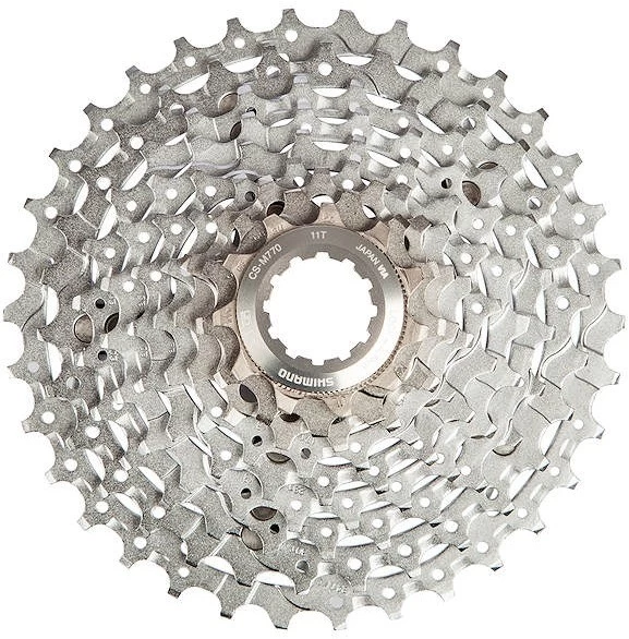 Die Shimano XT CS-M770 Kassette ist fĂŒr Trekkingfahrer, die beim guten alten 9-fach Antrieb bleiben wollen, immer noch die Kassette der Wahl. Der Ritzel-TrĂ€ger aus Aluminium und die neun Ritzel aus Stahl ĂŒberzeugen durch perfekte Steifigkeit. Dennoch ist die Kassette so leicht, dass sie sich auf langen Touren nicht als lĂ€stiger Ballast bemerkbar macht. Und auch wer kĂŒrzere Strecken bevorzugt, wird von der CS-M770 profitieren können, denn Shimano hat seine XT Serie fĂŒr die BedĂŒrfnisse unterschiedlicher Fahrertypen ausgelegt. Das gestrahlte Chrom-Finish sorgt fĂŒr einen gewissen Glanzeffekt. NatĂŒrlich verfĂŒgt auch diese Kassette ĂŒber das Hyperglide (HG) Ritzeldesign, mit dessen Hilfe die Kette weich und optimal gleitend von einem Ritzel zum anderen befördert wird.